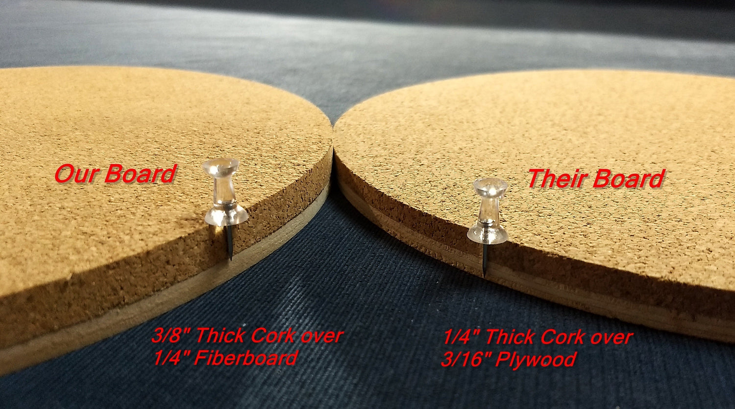 Our boards are made with 3/8" thick natural cork secured to 1/4" thick fiberboard.