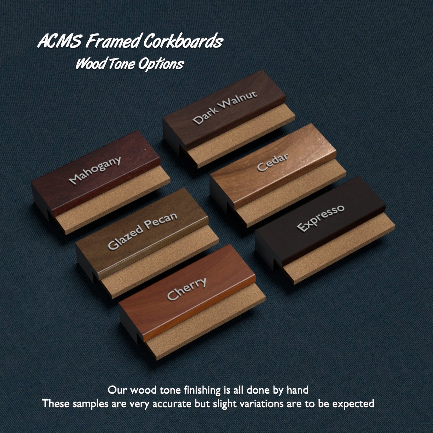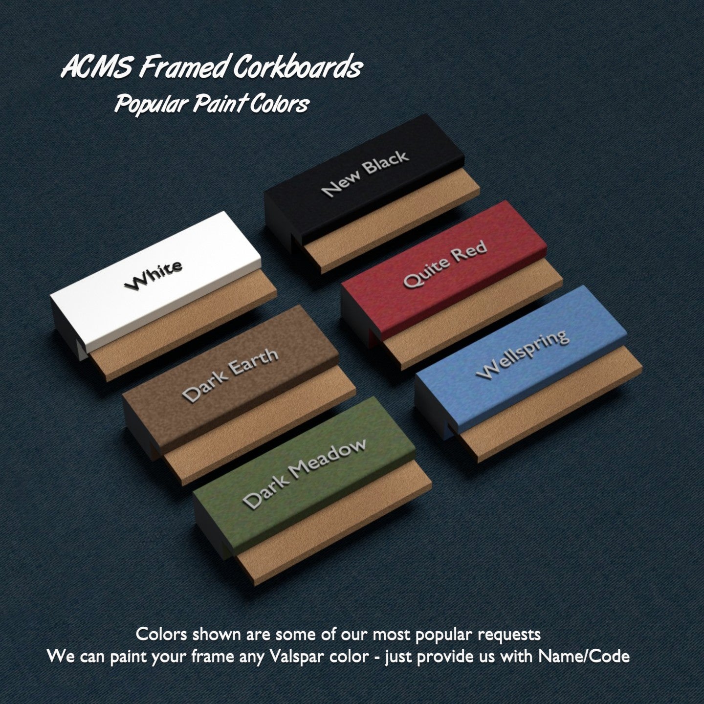 All ACMS Framed Corkboards incorporate 3/8" thick natural cork adhered to a 1/4" thick solid fiberboard backer board.