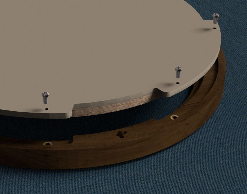 This cork assembly is secured to our beautiful wood frame using threaded nuts and bolts.