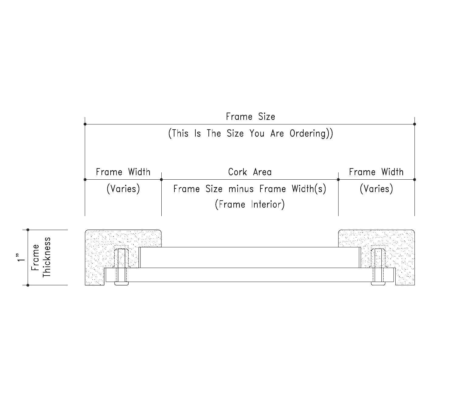 The INTERIOR cork area is based on Frame Width..you simply subtract frame width from the outside dimension.